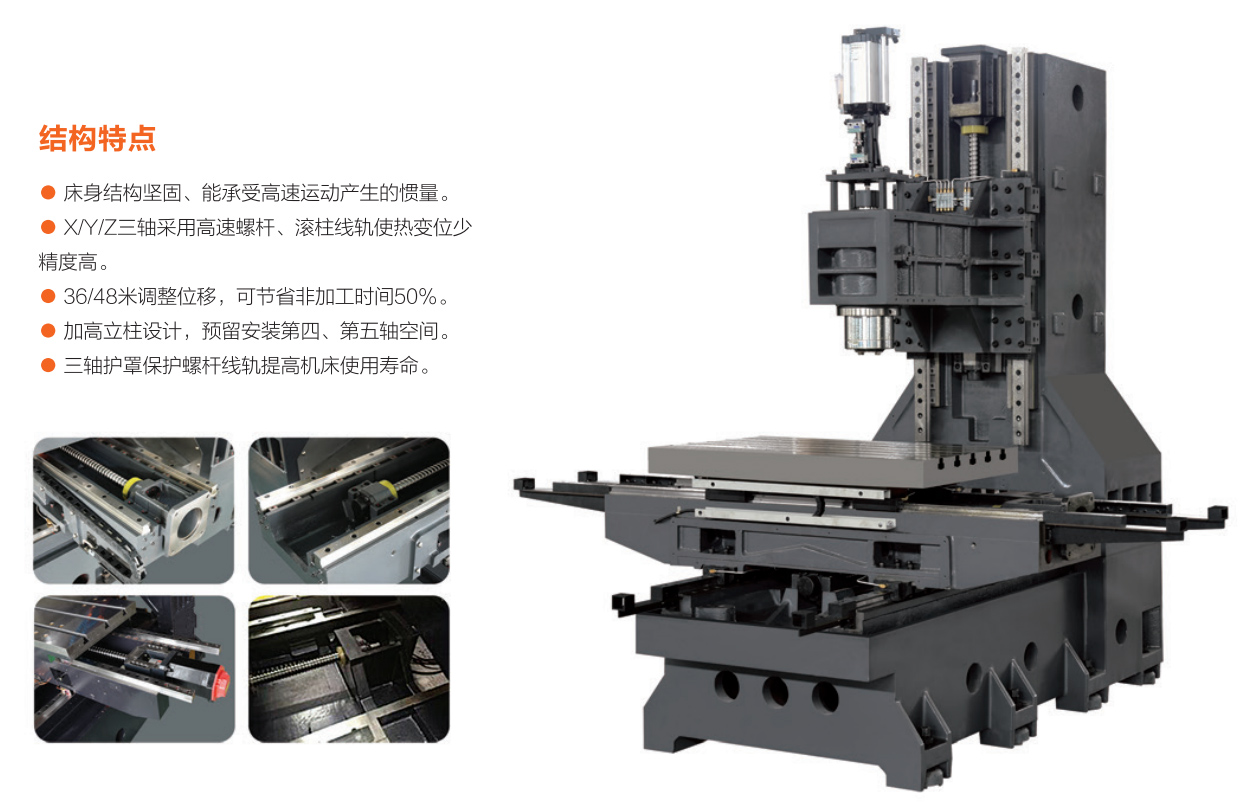 X/Y/Z三軸采用高速螺桿、滾柱線軌使熱變位少精度高。
